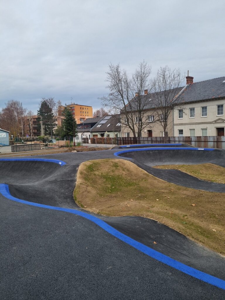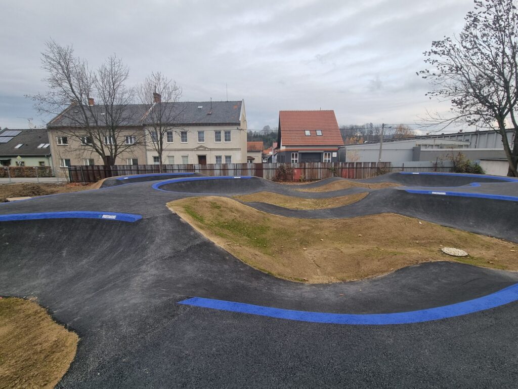 Tvar dráhy byl vytvořen modelací hutněného kameniva a povrch je asfaltový. Vznikl tady republikový unikát, nejdelší asfaltová jumpline, což je speciální část pumptracku navržená pro jezdce, kteří chtějí skákat a dělat triky. Přístup na sportoviště je z nově vybudovaného chodníku. Areál osvětlují víceúčelové solární lampy, které slouží i jako nabíjecí stanice.